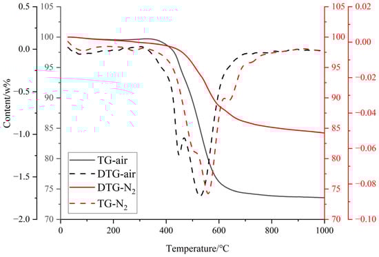 To further analyze the decomposition or reaction of the mineral phase in gangue during the heat treatment process, the original gangue samples were thermogravimetrically analyzed under nitrogen and air atmospheres and the test results are shown in Figure 4.