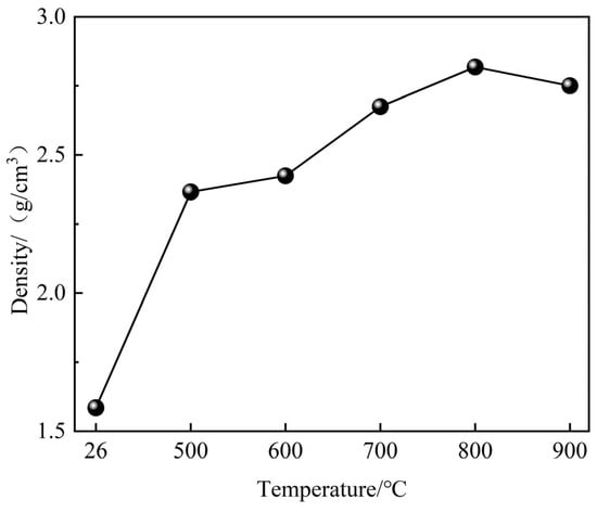 The density evolution of coal gangue after different thermal activation is shown in Figure 5.