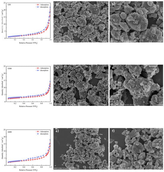 Figure 6 illustrates the quantity of nitrogen adsorption and desorption on the surface of coal gangue particles and SEM image after calcination at different temperatures. The adsorption isotherm of G26 and G500 exhibited minimal discernible characteristics. Afterward, as the calcination temperature increased, the adsorption isotherm of the calcined coal gangue samples after thermal activation at 600 °C, 700 °C, 800 °C, and 900 °C exhibited a gradual convergence towards the isotherms of Type II, with a bias towards the axis of relative pressure at relative pressure p/p0 values between 0 and 0.4. This indicates that the force between the sample and the nitrogen is weak, which suggests that the sample contains almost no micropores. When the relative pressure p/p0 was greater than 0.5, the isotherm displayed a pronounced increase and a concave downward shape, indicative of the emergence of the phenomenon of adsorption and capillary coalescence of the multimolecular layer. This observation substantiates the hypothesis that the sample contains a substantial number of mesopores and macropores. At a relative pressure of p/p0 = 1, the adsorption curve displayed an infinite ascending trajectory, indicating that the adsorption process had not yet reached saturation and that the sample contained a substantial number of macropores.