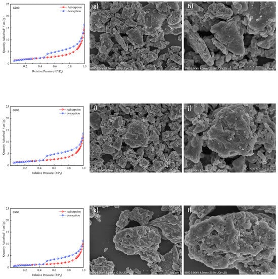 Nitrogen adsorption and desorption curves of coal gangue at different heat treatment temperatures and SEM image. (a,b) SEM image is about G26. (c,d) SEM image is about G500. (e,f) SEM image is about G600. (g,h) SEM image is about G700. (i,j) SEM image is about G800. (k,l) SEM image is about G900.