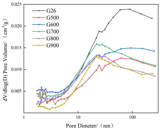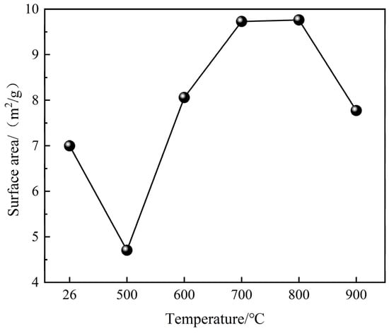 As can be seen from Figure 8, the specific surface area of G500 exhibits a reduction compared to G26; afterward, the specific surface area gradually increases in the range of 500–800 °C. Then, the surface area shows a reduction when the temperature reached 900 °C.