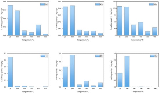 From the leaching results of calcined coal gangue in Figure 10, it can be seen that the original coal gangue (G26) can release a number of heavy metal ions, such as Cd, Cu, Mn, Ni, Pb and Zn. In general, the heavy metals that can be leached out of coal gangue often exist in sulfide-bound state, carbonate-bound state and silicate-bound state in sulfide minerals, carbonate minerals and silicate minerals [].