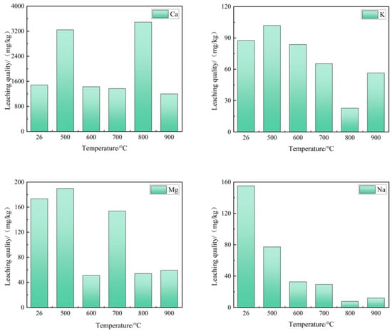 The leaching results of Ca, K, Mg and Na in coal gangue under different temperatures are shown in Figure 11. The leaching of Mg, K and Na from calcined samples gradually decreased with the increased calcination temperature. In a previous study, sodium, potassium, and magnesium elements were predominantly associated with clay minerals in kaolinite []. During calcination, kaolinite was restricted and the sodium, potassium, and magnesium elements were volatilized; Ca is primarily associated with carbonates in coal gangue, which have a stable crystal structure and a higher decomposition temperature. Consequently, Ca is less prone to volatilization, exhibiting minimal fluctuations in its leaching amount.