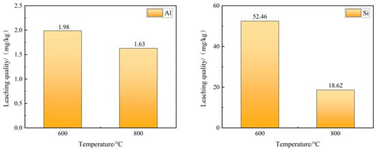 The formation of reactive Si and Al is the key to the reactivity of kaolinite after calcination. It has been confirmed that the optimal calcination temperature ranges from 600 to 800 °C []. These properties give calcined kaolinite a potential utilization in cementitious materials. To confirm the reactive Si and Al formation, calcined coal gangues at 600 °C and 800 °C were selected for test. In Figure 12, the leaching of Al and Si from G600 and G800 is presented.