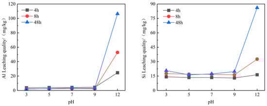 It is clear to see that the leaching of Al and Si in calcined coal gangue (G800) was controlled by pH and duration. There is no significant change in Al leaching before the pH value reached 12; the increase in leaching duration showed a limited effect on the enhancement in Al leaching. After the pH was increased to 12, the leaching of aluminum exhibited a considerable increase over time; the highest leaching of Al was observed at a shaking time of 48 h. For Si leaching of calcined coal gangue (G800), similar results were recorded. This indicates that in an alkaline environment, reactive Al and Si in calcined coal gangue can be effectively extracted. In other words, these can be used as potential ingredients in cementitious binders of building materials production. A similar observation was also reported in previous studies. Xie et al. demonstrated [] that the active silica fraction released from coal gangue following calcination and phase transformation is readily dissolved in alkaline solution. The study by He et al. indicated [] that the Al-O bond length in kaolinite is longer than the Si-O bond length. Additionally, the strength of the Al-O bond is weaker than that of the Si-O bond. Furthermore, the activation energy of the Al-O bond is approximately 76–125 kJ/mol, while that of the Si-O bond is approximately 460 kJ/mol. Therefore, the rate of Al-O bond cleavage is faster, which explains why the leaching of Al is higher than Si.