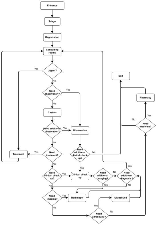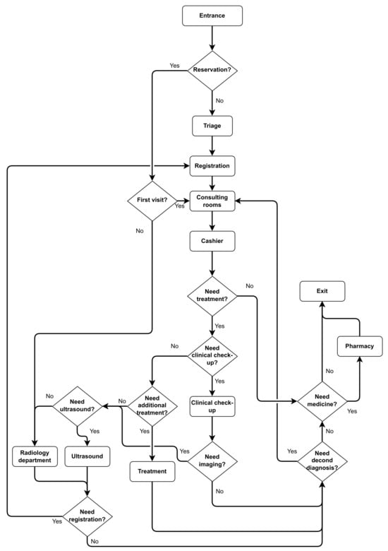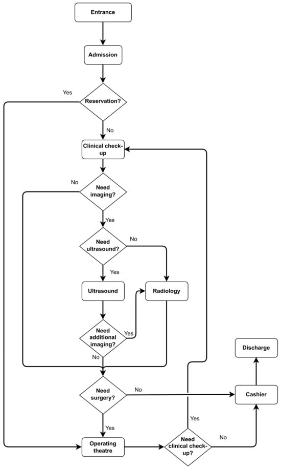 - Discrete event: The discrete event is the cause of the system state change. The state of the system in the DES model only changes due to the occurrence of events [22]. For example, in a hospital DES model, the patient’s walking distance in the hospital only changes if the patient moves to the next room.