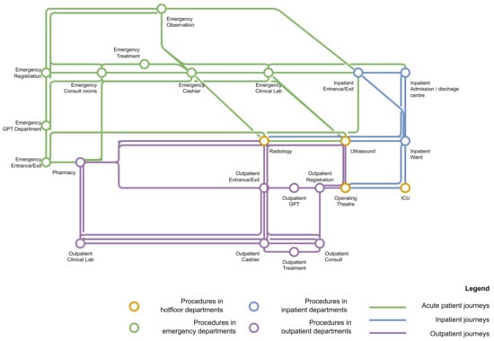 - Use case 1: The architect can use the HDSS to semi-automatically create a hospital layout at the layout design stage of a new project or optimize the hospital layout of an existing project. For this use case, the operational information of patients’ medical procedures in the hospital is needed for obtaining an Activity Relations Charts (ARC) model (for further explanations please see Section 3.2). Thus, the HCM should contain the operational information on patients’ medical procedures in the hospital.