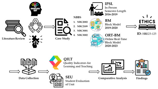 This study adopts a case study approach to evaluate the NBBS program at Victoria University over seven years (2016–2023). The methodology is designed to compare three delivery approaches: (1) IP-SL (2016–2019), (2) IP-BM (2019–2020), and (3) ORT-BM (2020–2023), focusing on their impact on student engagement, satisfaction, and teaching quality.