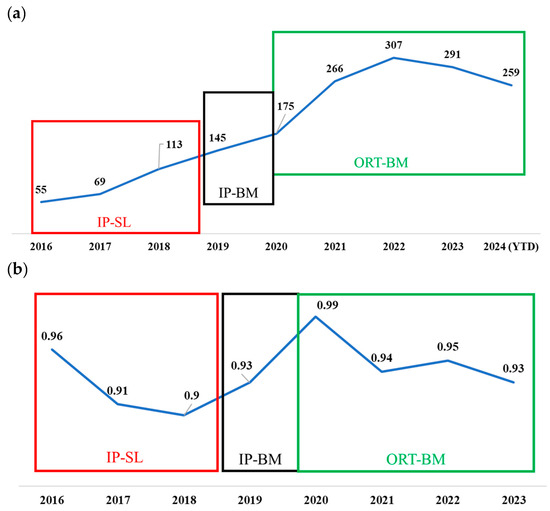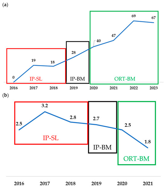 Figure 2a illustrates a significant increase in NBBS students over seven years, with a rise from 55 in 2016 to 145 in 2019–2020 after transitioning from IP-SL to IP-BM. The shift to ORT-BM from 2020 further accelerated this trend, with a peak during the 2020–2021 lockdown. This successful implementation led Victoria University to continue offering NBBS in ORT-BM even after universities reopened in 2022, resulting in a six-fold increase in students since 2016.