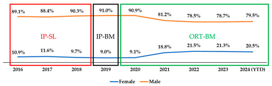 The transition from traditional IP-SL teaching and learning to ORT-BM might have addressed another key parameter in the construction industry: gender equity. The analysis of the QILT data, broken down by gender, is presented in Figure 3. This aligns with Objective 3, which evaluates gender equity and accessibility, highlighting how the flexibility and inclusivity of ORT-BM contributed to an increase in female enrollment in the NBBS program.