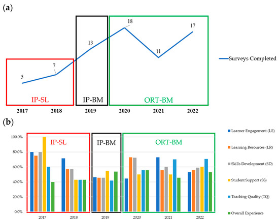 Figure 5a demonstrates the SES survey response rates were lowest in 2017, increasing from 5 to a peak of 18 in 2020, suggesting improved data reliability. Figure 5b reveals that while traditional IP-SL scored well in SS and LE, it was rated poorly in overall experience, reflecting a gap between expectations and reality. The shift to IP-BM in 2019 saw declines in LE, LR, and SD, but improved the overall experience. With the introduction of ORT-BM in 2020, teaching quality has increased, while the overall experience remained moderate at around 50%, suggesting a need to enhance the “sense of belonging”.