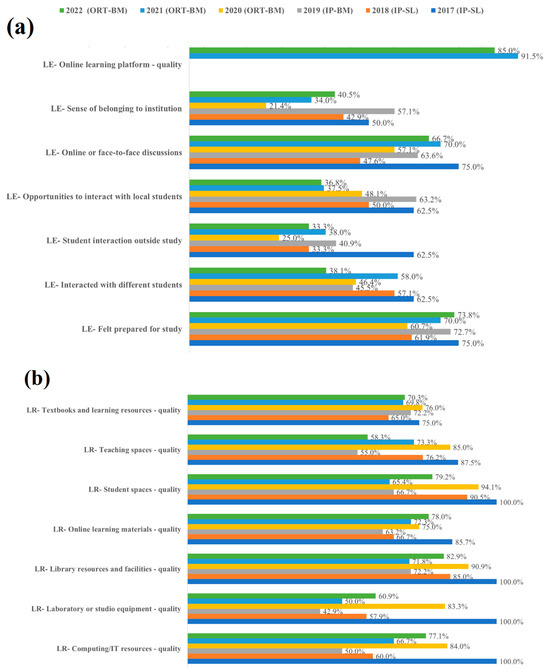 These findings align with Objective 2, which analyzes satisfaction trends, highlighting how ORT-BM sustained improvements in key areas such as Learner Engagement (LE), Learning Resources (LR), Skill Development (SD), Student Support (SS), and Teaching Quality (TQ). Notably, NBBS continued with ORT-BM after 2022, while others reverted to IP-BM. Figure 5 presents third-year students’ SES responses on these dimensions between 2017 and 2022.