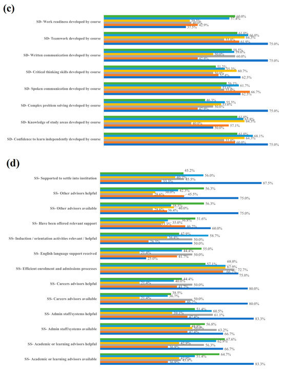 Figure 6d shows student support consistently lagging in satisfaction. Despite Victoria University’s strong employability services [112], low satisfaction suggests students may be unaware of these resources. The Built Environment team initiated online engagements, such as webinars, to facilitate direct interaction with career experts.