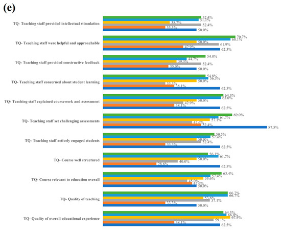 Completing students’ feedback regarding five SES criteria: learner engagement (a), learning resources (b), skill development (c), student support (d), and teaching quality (e) from 2017 to 2022.