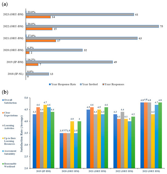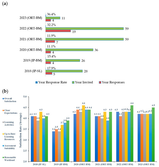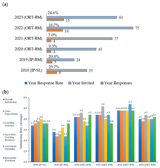 This section evaluates the annual SEU response rates across teaching approaches to highlight the impact of pedagogical shifts. Figure 7 illustrates these response rates over the studied period (2016–2023) and the average scores out of 5, providing insights into Objective 1, which examines how different instructional models influence student engagement over time. Figure 7a displays the response count and rate for each year, with the legend indicating the educational methods used (IP-SL, IP-BM, and ORT-BM). Figure 7b presents the mean scores for each criterion of the SEU, with 5 representing the highest possible score.