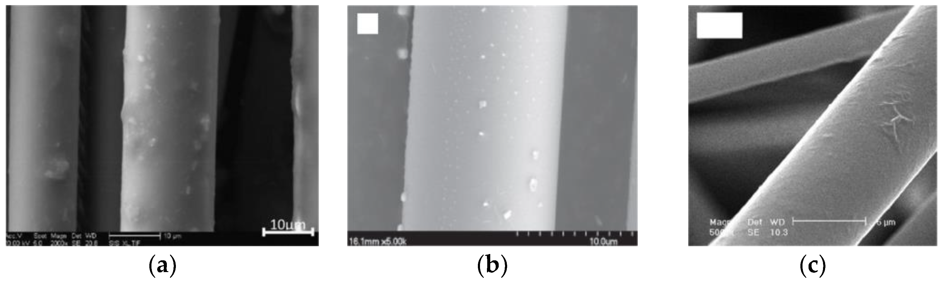 Figure 2. SEM images of the BF surface: (a) surface roughening [33]; (b) enhancing interactions with nanoparticles [34]; and (c) plasma treatment [36].