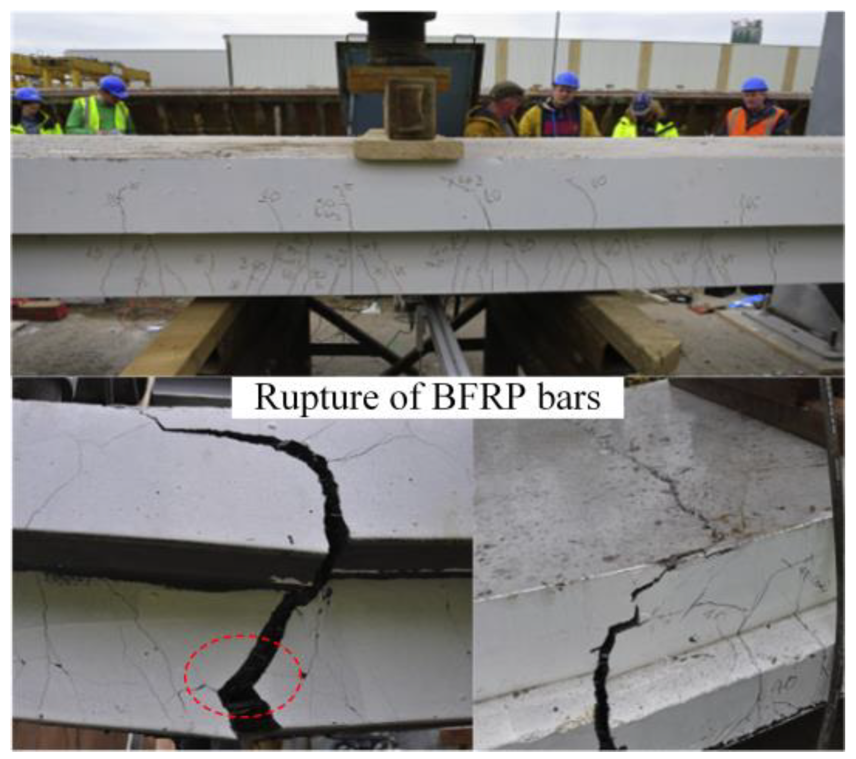 Exploring the performance of components reinforced with BFRP bars was deemed crucial. Abed and Alhafiz (2019) [58] studied the influence of different types of fiber on the bending performance of concrete beams reinforced with BFRP bars. For this purpose, a four-point bending test on the beams was carried out, and the failure mode is shown in Figure 5. All the specimens first experienced concrete crushing, followed by the rupture of the BFRP bars. Compared with plain concrete beams, both BFs and synthetic fibers significantly enhanced the bending load-bearing capacity of the beams, increasing it by 12% and 19%, respectively. Additionally, BFs exhibited superior performance in terms of crack control, leading to a 21% enhancement in the cracking load of plain concrete beams.