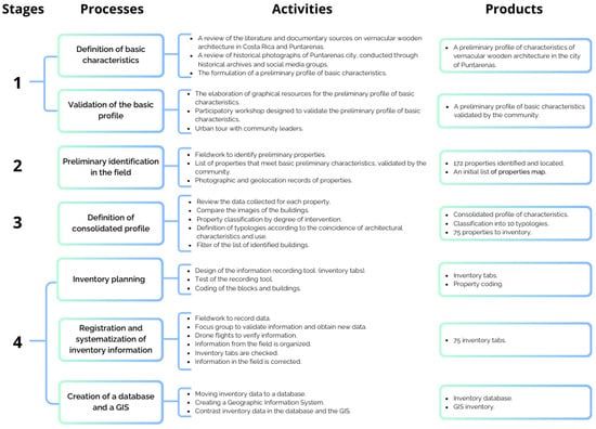 The study area encompasses the Central, Carmen, and Playitas neighborhoods of the Puntarenas district of the canton of the same name, encompassing a total of 93 blocks. To guide the methodological process, four stages were established, delineating their respective processes, activities, and products (Figure 1).