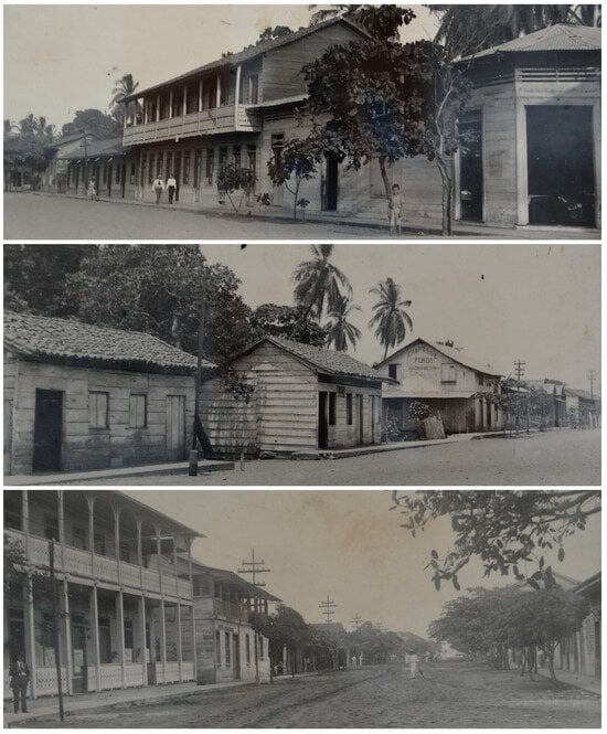 The documentary analysis results revealed a deficiency in researching vernacular wood architecture in the country, with a lack of identifiable publications. Concerning Puntarenas’ urban center, the identified information on wood architecture is relatively scarce; most references were found in texts about the city’s history [14,15] and the history of Costa Rican architecture [16,17,18,19,20]. The historical archives contained limited visual documentation of the subject under investigation, although it was possible to locate photographs of the city and notable urban spaces such as the pier (Figure 3). A search on social media revealed that seven Facebook groups had posted old photographs of Costa Rica and Puntarenas; 74 pictures belonged to the study area.