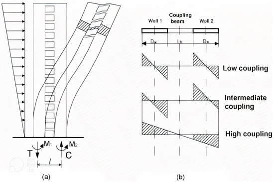 The behavior of hybrid coupled shear walls based on different coupling degrees: (a) typical coupled shear wall behavior and (b) distribution of strain [2].