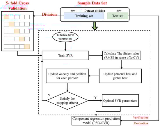 Figure 3 illustrates the SVR parameter search process using the PSO method. In this process, 80% of the training set was used to tune the hyperparameters. The training data were divided into five subgroups. The particle swarm attempted to find the optimal hyperparameters on four of these subgroups, then evaluated the root mean square error (RMSE) on the remaining subgroup. The fitness function was defined as the RMSE, and the hyperparameter values that minimized the fitness function were selected as the optimal ones. This method ensures robustness and generalization of the model by reducing errors that might arise from an imbalanced data distribution. Finally, a test set (20% of the original data) was used to validate the model’s predictive performance. Assuming that the developed regression model makes accurate predictions on both the training and test datasets, the likelihood of under- or over-fitting is minimal in this scenario.