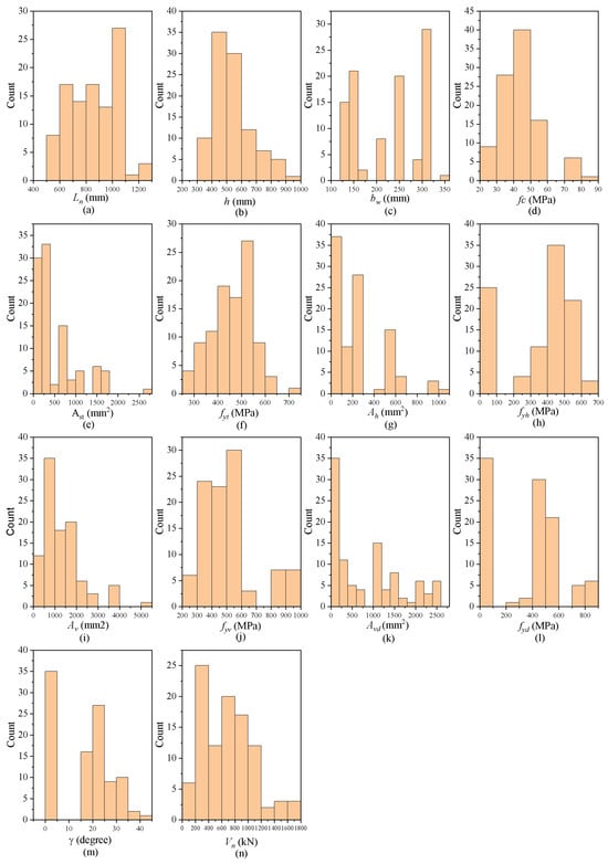The dataset employed in this research is composed of 13 predictor variables and one response variable, representing various geometric and material properties of beams. It was originally developed by Chetchotisak et al. [53] with the 100 coupling beam experimental shear capacity tests. The statistical summary of the variables is provided in Table 1, with detailed distributions illustrated in Figure 4. These figures provide insights into the range and concentration of values for each feature, which are critical for predicting the shear capacity of coupled beams.