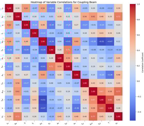 Specifically, a strong positive correlation is observed between and (0.72), indicating that as the beam width increases, the shear capacity of the coupling beam also tends to increase. Similarly, and exhibits a high positive correlation of 0.77, highlighting the important role of diagonal reinforcement in the influence of shear strength. In contrast, the correlation between and is significantly negative (0.47), suggesting that as the area of the tensile steel increases, the angle of inclination tends to decrease.