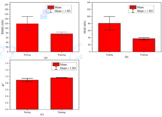 The results obtained from the five-fold cross-validation used to assess the performance of the SVR-PSO model are illustrated in Figure 7 and Table 2. In all metrics, the model exhibits consistency and strong predictive capacity. The average value of R2 is 0.901, with most folds showing R2 values above 0.83, highlighting the model’s ability to effectively capture the variance in the data. This resilience in model performance is further supported by the RMSE values, which average 116.647 with a standard deviation of 28.716 kN, indicating a stable error rate across the folds. Furthermore, MAE, averaging 77.779, provides a measure of the error magnitude that remains relatively consistent throughout the evaluation process. The bar chart (Figure 7) accompanying these results visually reinforces the stability observed, with values clustered closely around the mean across all five folds. Despite some fluctuations, particularly in Folds 2 and 4, the SVR-PSO model demonstrates generally reliable performance throughout. The cross-validation results highlight the model’s robustness and its potential for practical application, as it consistently delivers accurate predictions across different subsets of data. In summary, the performance of the model in terms of R2, RMSE, and MAE positions it as a strong candidate for future predictive tasks.