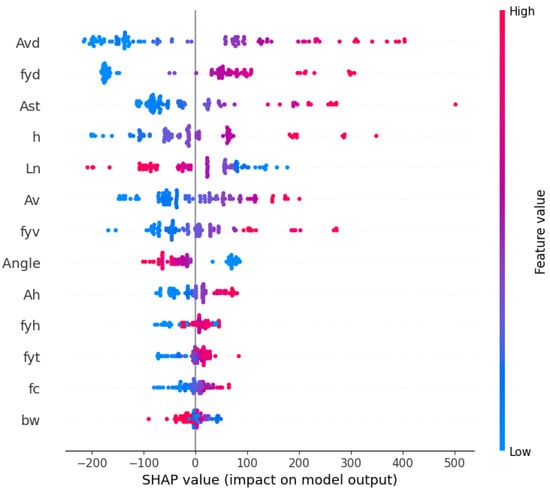 In Figure 12, is recognized as the most influential predictor, followed by , , h, , , , and angle. The other predictors are comparatively less significant for the model’s predictions. However, Figure 12 does not indicate whether these input factors have a negative or positive effect on the output; it only illustrates the level of feature relevance. To gain deeper insights, SHAP summary graphs, as shown in Figure 13, can be utilized. These graphs allow researchers to better understand how each feature influences changes in the model output by showing the precise impact of each input variable on the SHAP values for individual samples. Positive SHAP values indicate that a feature has a beneficial impact on the output, while negative SHAP values reflect the opposite. Darker hues signify greater impact, with red representing positive effects and blue indicating negative ones. Each point represents the SHAP value for a specific input variable and a particular input instance. Figure 13 illustrates how the features on the left side are arranged based on their importance as shown in Figure 12.