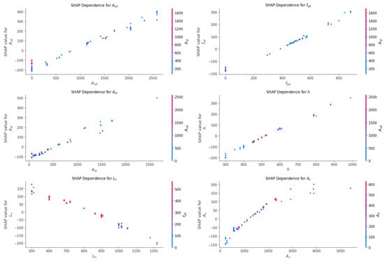 The SHAP summary graph offers a summary of the overall influence of each feature on the SHAP values but does not capture the intricate relationships between individual features and their corresponding SHAP values. To address this limitation, SHAP dependency plots were utilized to gain deeper insights into feature interactions. These plots highlight key features and their interactions to illustrate their combined impact. As shown in Figure 14, the shear capacity of coupling beams is influenced by complex feature interactions rather than simple linear relationships. Additionally, the shear capacity is highly sensitive to the input range of these features, emphasizing their critical role in the model’s predictions. For example, when is equal to 0, the presence of in the coupling beam contributes to an improvement in shear capacity. Conversely, when reaches its highest value, the effect is reversed, and a lower value of is associated with a positive impact on shear capacity. Also, the shear capacity is significantly influenced when is in the range of 0 to 3000. Beyond this range, the influence stabilizes, indicating a diminished effect of on shear capacity at higher values. Additionally, has a negative impact on the shear performance of the coupling beam. These are useful and intriguing results. In summary, these interpretative data are essential for engineering, as they help engineers adjust design parameters to satisfy certain shear performance standards.