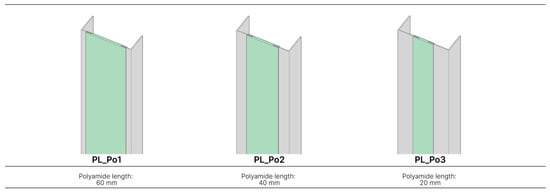 The second group of models was designed to mitigate the thermal bridge effect of the steel studs by incorporating a less-conductive material into the web section. Specifically, a rigid polyamide element was introduced in the middle of the web, oriented vertically. In order to determine whether the width of the polyamide member would influence the heat flux, three models were proposed, each featuring a different width for the added material (60 mm, 40 mm, and 20 mm) (see Figure 6).