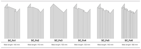 The third group involved modifying the shape of the web section by introducing simple folding geometries. This approach aimed to increase the length of the heat flux path along the web cross-section of the steel stud, therefore improving thermal performance. Six distinct folding configurations were created, as shown in Figure 7.