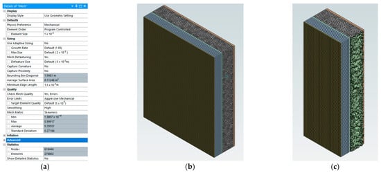 Model general information. (a) Mesh details; (b) LSF wall panel with the mesh detailed; (c) Cross-section of the wall panel.