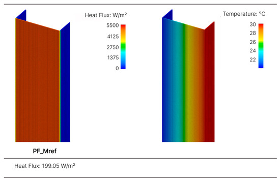 This section presents the analysis of the simulation results for the steel studs featuring different geometric alternatives across the 3 groups. For comparison purposes, the first steel stud simulated was a standard commercial solution, serving as the reference model (PF_Mref), without slots (see Figure 9). This reference model presented a total heat flux of 199.05 W/m2.