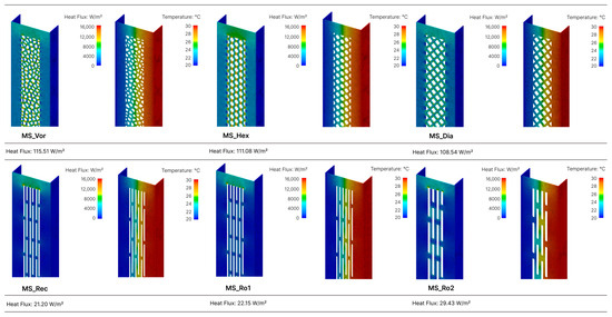 The highest heat flux within Group 1 is exhibited by the MS_Vor model, which has an irregular mesh and edges with a geometry based on Voronoi. This model shows a heat flux of 115.51 W/m2, representing a 42% reduction compared to the reference-steel stud. Conversely, the optimal result in this category is achieved by the MS_Rec model, which incorporates intercalated rectangular gaps with straight edges, resulting in a heat flux of just 21.20 W/m2. Figure 10 provides a graphical representation of the six models simulated.