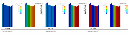 The incorporation of a material to partially replace the web section of the steel stud proved to be highly effective, with the models in Group 2 delivering the most favorable results. The PL_Po1 model, comprising a 60 mm wide rigid polyamide component, achieved the best performance among all analyzed options, with a heat flux of just 4.65 W/m2. This represents a reduction of approximately 98% in heat flux compared to the reference model. The PL_Po3, with a 20 mm wide polyamide component, exhibited a heat flux of 13.09 W/m2, the highest within Group 2. However, it still ranked as the third-best result overall, achieving a nearly 93% reduction in heat flux. Figure 11 illustrates the simulated models.