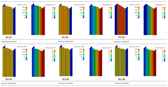 The component models of Group 3, featuring variations in folding shapes, revealed heat flux reductions of up to 53% compared to the reference model. These results are particularly noteworthy, as they are derived from modifications to the reference model that do not incorporate slots and/or the insertion of different materials. The best-performing model in this group is the SC_Fo6, which has the largest number of folds and presents a heat flux of 94.19 W/m2. In contrast, the least favorable outcome is the SC_Fo2 model, with a heat flux of 180.01 W/m2, closely resembling the result of the reference model. The results of the simulations are presented in Figure 12.
