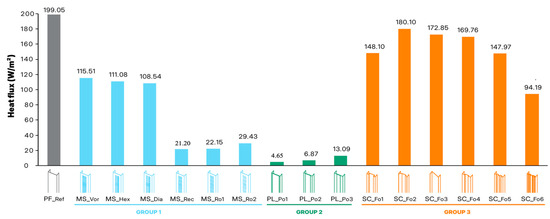 The modified web section simulations were compared to the reference case, with results organized by groups according to the methodology outlined earlier. Figure 13 shows the results of all simulated steel studs and clearly illustrates that all proposed models achieved heat flux values lower than the reference model. Based on the analysis, the best-performing models from each group were selected for further evaluation.