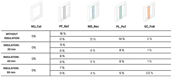 Figure 16 shows the percentage increase in heat flux for each scenario. The results indicate that PL_Po1 is the most promising model, with a 14% decrease in heat flux. In all cases, it was the model with a higher reduction in thermal bridge. The MS_Rec model also shows a significant performance with reductions ranging from 4% to 12% compared to PF_Ref.