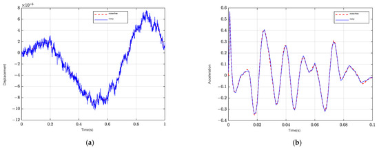Comparison of noise-free and noisy measurements: (a) 9th DOF displacement; (b) 9th DOF acceleration.