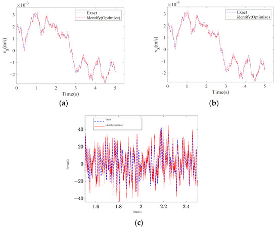 Identification results: (a) identification of displacement response; (b) identification of velocity response; (c) identification of unknown input.