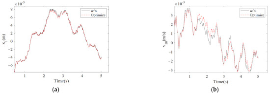 By comparing the identification results (denoted as w/o) of the KF-UI with covariance matrices obtained empirically as the values of , , , it can be seen from Figure 5 that the identification accuracy of the method is improved, thus demonstrating the effectiveness of the proposed method.