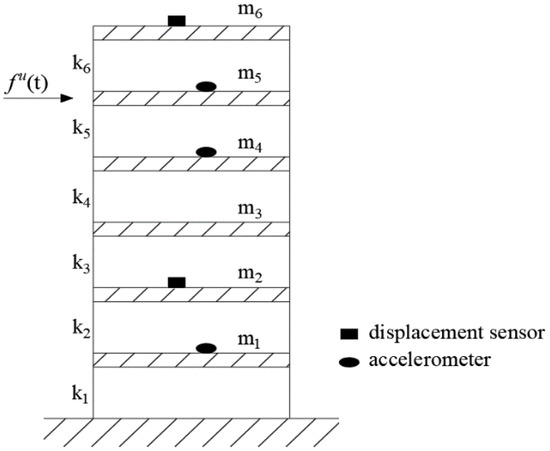 The effectiveness of the proposed method for the optimization of EKF-UI covariance matrices is validated using a 6-story shear frame model, as shown in Figure 6. It is assumed that the structural stiffness of each story is and the mass of each story is . The shear frame is assumed to have Rayleigh damping with two damping coefficients, and . The sampling frequency is 1000 Hz. White noise excitation is applied to the 5th story of the frame. The horizontal acceleration of the 1st, 4th, and 5th stories and the displacement responses of the 2nd and 6th stories are measured. Measurement noises are also considered by adding Gaussian white noise with 3% in root mean square.