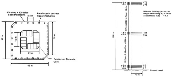 The finite element model of a 76-story concrete office building is used in this section [26]. Figure 8 shows the cross-section and profile of the benchmark model. This building is located in the city of Melbourne, Australia, with an elongated shape and a height-to-width ratio of 7.3. The model has 76 translational and 76 rotational degrees of freedom, and all 76 rotational degrees of freedom are removed by static condensation. The wind load of the structure is simulated by the Davenport spectrum. Ten displacements and 20 acceleration responses of the structure are observed and the effect of 1% noise is considered. First, the load and state of the structure are identified in mode space using the KF-UI method, then the physical responses and loads of the structure are reconstructed by the mode transformation. The mode truncation is conducted by POD to take the first five modes. Considering the impact of model parameter uncertainty, a 10% reduced K is adopted as the structural parameter.