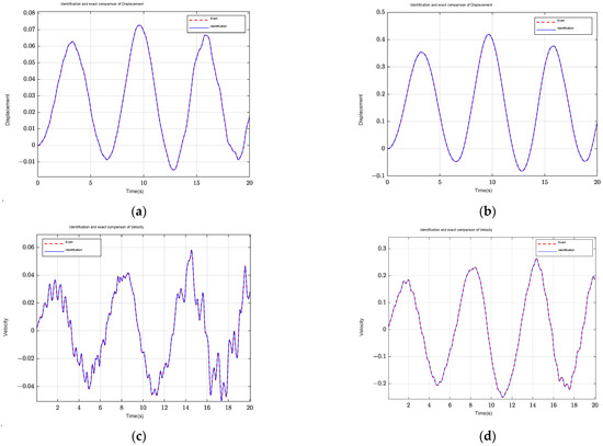 Identification results: (a) identified 20th floor displacement response; (b) identified 55th floor displacement response; (c) identified 20th floor velocity response; (d) identified 55th floor velocity response.
