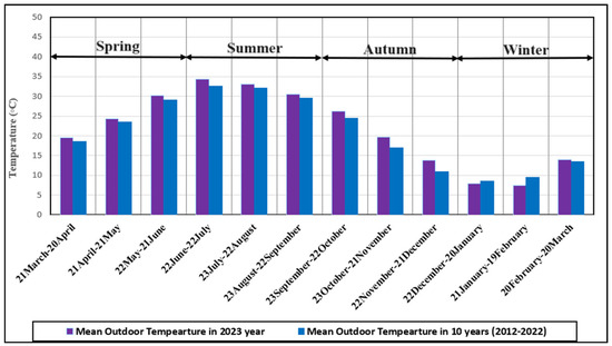 The case study employs an experimental model with interior dimensions of 1 m × 0.75 m × 0.75 m, representing a 0.25-scale version of an actual room with dimensions of 4 m × 3 m × 3 m. This model is utilized to evaluate a passive cooling system in Yazd, Iran (latitude: 31°53′50″ N; longitude: 54°22′3″ E; altitude: 1230 m). The geographical location is characterized by a dry climate, featuring cold winters and hot summers according to the Hijri calendar months. Figure 2 illustrates the comparison of the mean outdoor temperatures in Yazd over the past decade [26,27] with those recorded during the experimental study in 2023. Furthermore, the average temperature variation between day and night is 10.3 °C for the spring season, 11 °C for the summer season, 10.5 °C for the autumn season, and 10.2 °C for the winter season.