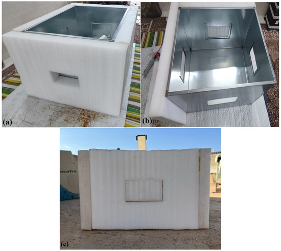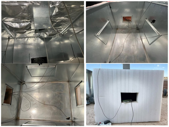 The model’s walls are constructed from 3 mm galvanized sheets, which are insulated on the external side with a 10 cm thick foam to minimize heat transfer to the surrounding environment (Figure 3).