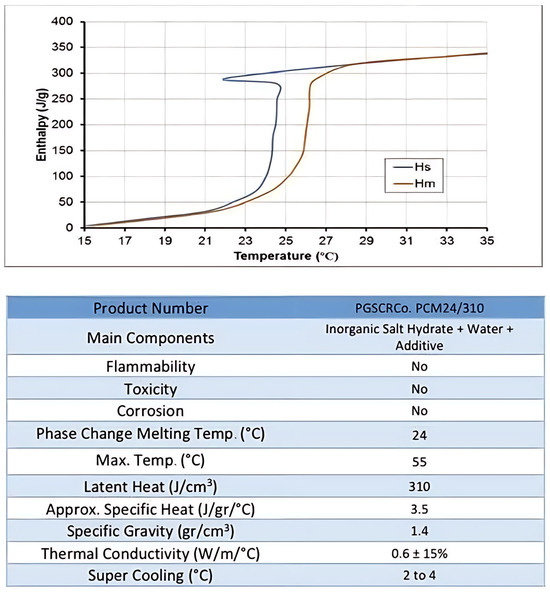 To integrate PCMs into this model, several key considerations must be addressed, including the use of non-combustible building materials. Consequently, the PCM must be composed of an inorganic material. For optimal performance, the PCM should undergo phase change within the comfort temperature range, with a maximum temperature of 25 °C. The PCM must also possess sufficient heat capacity to provide adequate latent heat storage. Taking all these factors into account and reviewing the available natural and laboratory-produced PCMs, it was determined that no natural PCMs meet the required specifications. Among the laboratory-produced PCMs, only one material is available in Iran, albeit in limited quantities, and has been selected for this project. The chosen PCM is an inorganic salt hydrate with the chemical formula PGSCRCo. PCM24/310 (Figure 4). Its enthalpy-temperature diagram and technical specifications are shown in Figure 5.