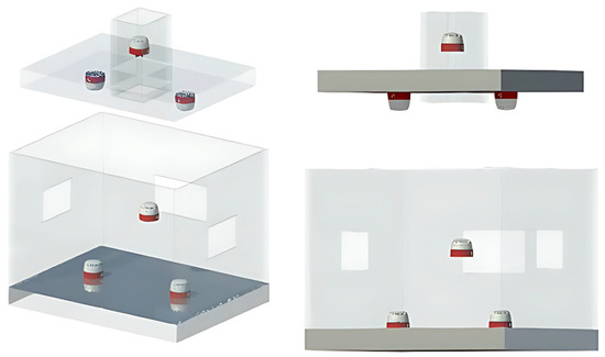 Additionally, two windows with dimensions of 5 cm × 8.7 cm at a ¼ scale of the actual sample dimensions 20 cm × 35 cm were considered, with a series of tests conducted on the opening and closing of the windows. Moreover, the ceiling features a chimney with dimensions of 15 cm × 10 cm × 40 cm, which is intended to enhance the ventilation inside the room (Figure 3).