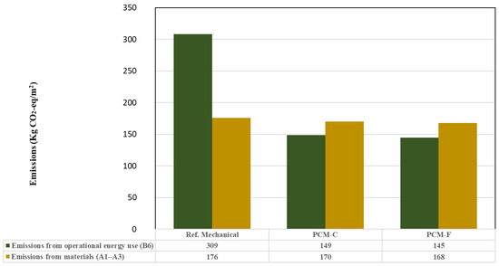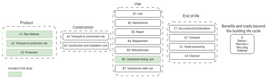 This assessment includes only the product stage (A1–A3) and the operational energy use during the Use stage (B6) as shown in Figure 10.